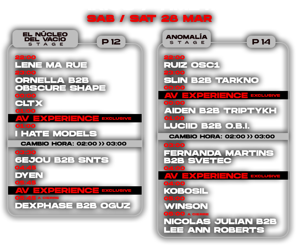 Recuerda: la noche del sábado 28 al domingo 29 de marzo adelantamos el reloj, a las 02:00 serán las 03:00 (horario de verano). La hora de cierre de la segunda jornada del festival será a las 07:00 horario de verano que entra en vigor.