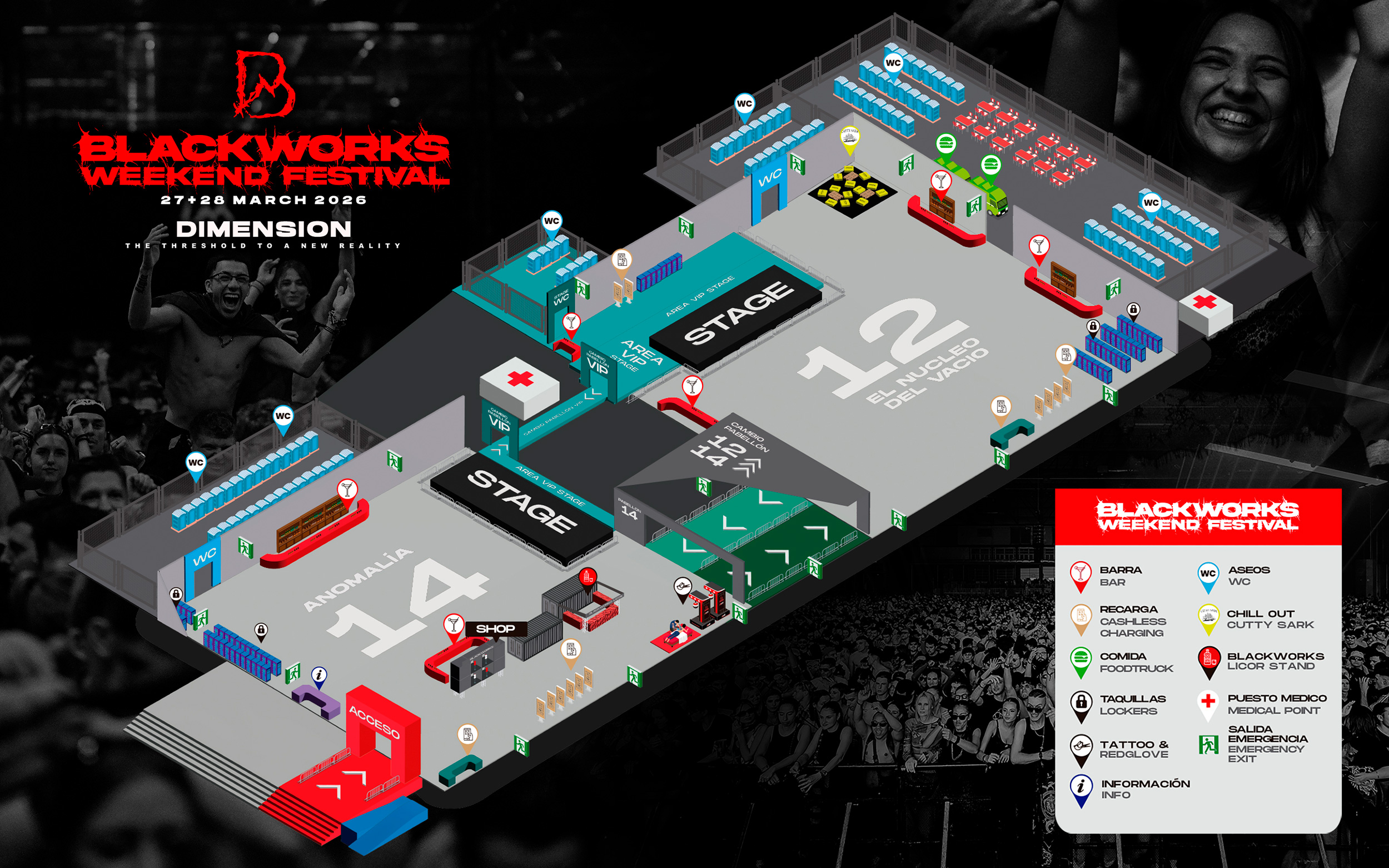 En Blackworks Dimension, cada elemento del festival —sonido, luz, visuales e interacción del público— funciona como una capa que se superpone a la siguiente, generando una experiencia inmersiva y multidimensional.